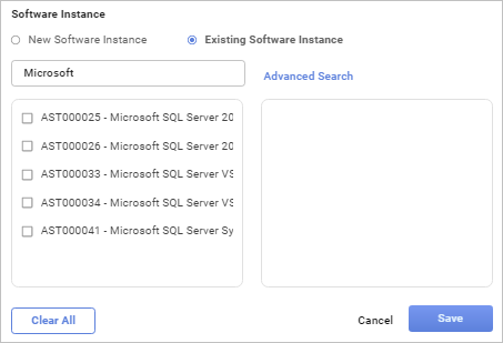 | 2. | Enter the search criteria to locate the existing software instance. See also Advanced Search. |