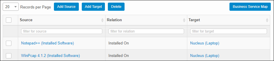 Use this function to manage the relationships between sources and targets. The Discovery application detects the Connected To, Runs On, Communicates With, Installed On, Component Of, Physically Connected To, Attaches and Used By relationships during a scan.