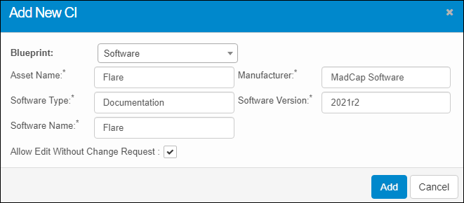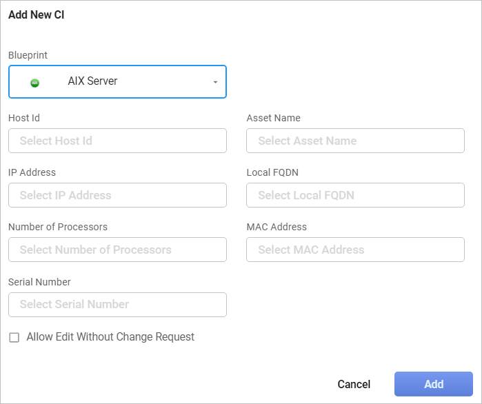From the Blueprint drop-down list, select the applicable type of configuration item. Based on the selection, the fields in the dialog box change. |