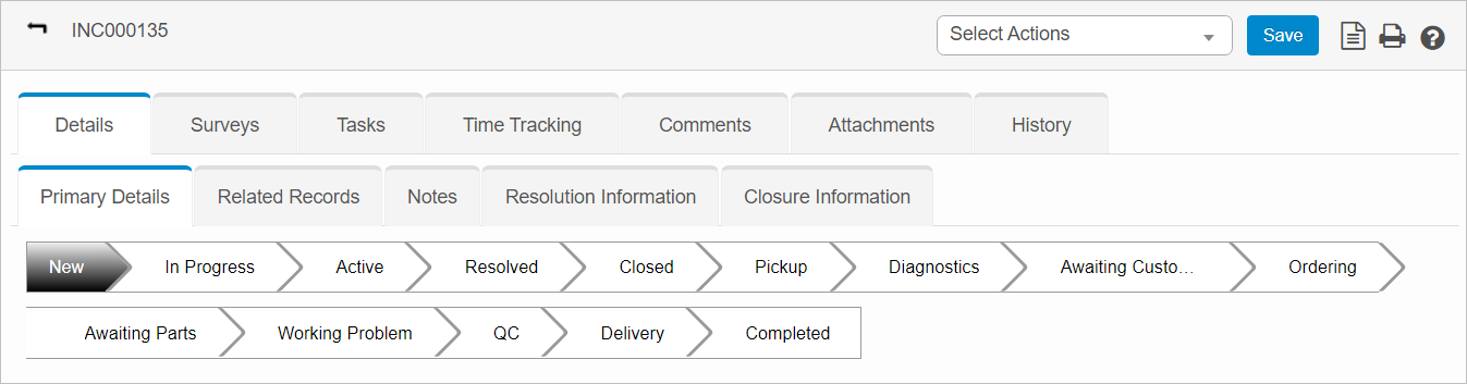 When viewing an incident, a "breadcrumb" trail is shown with statuses for the incident. The statuses change based upon the type of incident. An example is shown below.