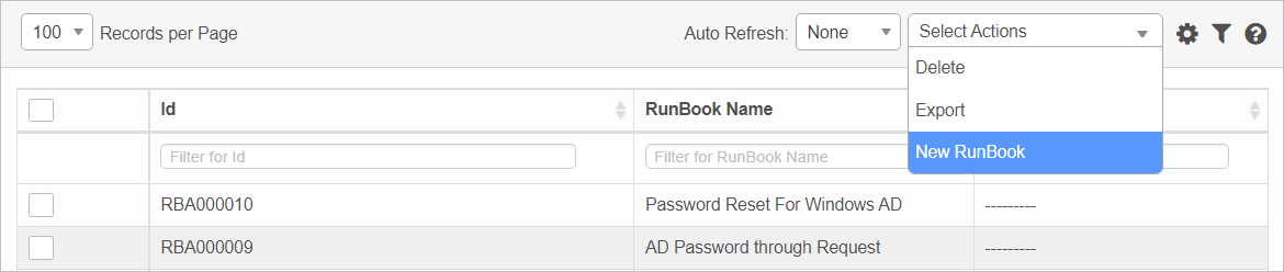 | 1. | From the Select Actions drop-down list, choose New RunBook. The New RunBook window displays. |