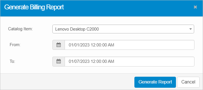 | 2. | In the Catalog Item field, click the drop-down list and select the item for which a billing report is to be generated. Select All if the report should contain every catalog item. |