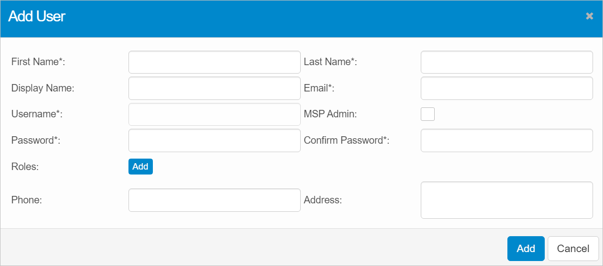 In the Roles field, click Add, then search for and select the roles for this user. If no role is assigned, the Admin privilege is considered the default role.
