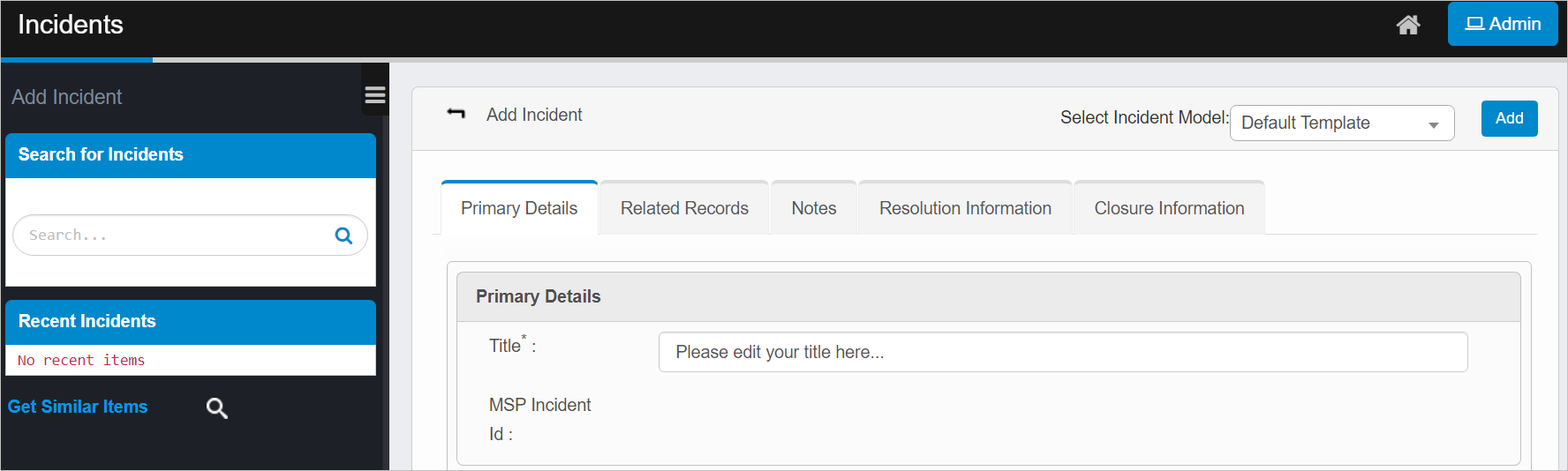 When editing an existing incident, other tabs are displayed. Refer to ITSM > Incident Management > Incidents.