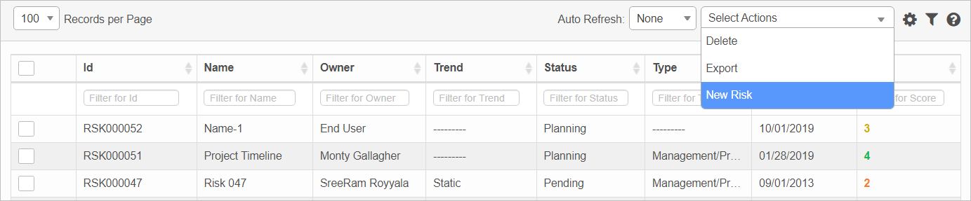 Indicates the current state of a risk. The statuses of risks are New, Planning, Action, Pending, Resolved, Deferred and Deleted. |