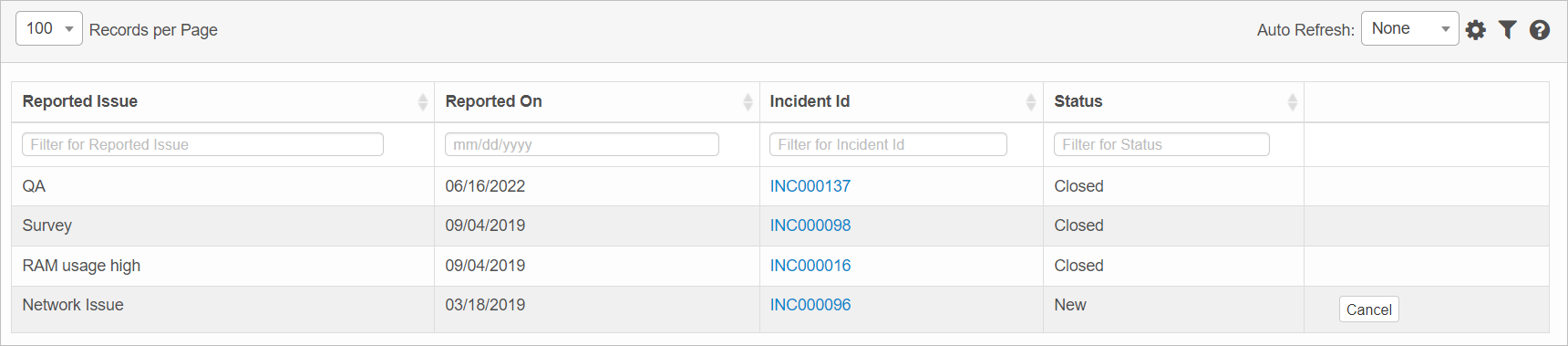 In the navigation pane, select Self Service > My Incidents. The resulting window displays a list of all incidents.