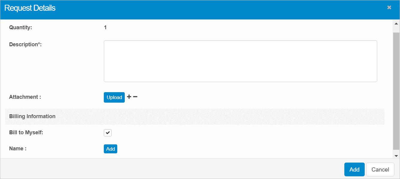 Under Billing Information, select either Bill to Myself or click Add, then search for and select the user who will bill for this order. |